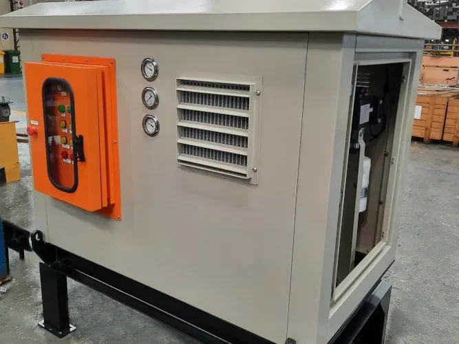 The hydraulic system consists of cylinder/s and a power pack which allows the fully loaded ore skip/s to be discharged into the headgear bin when skip/s docs in the discharge area inside the headgear structure. The cylinder movements are controlled by an automated (PLC controlled) hydraulic power pack which provides hydraulic fluid to the double acting cylinders.